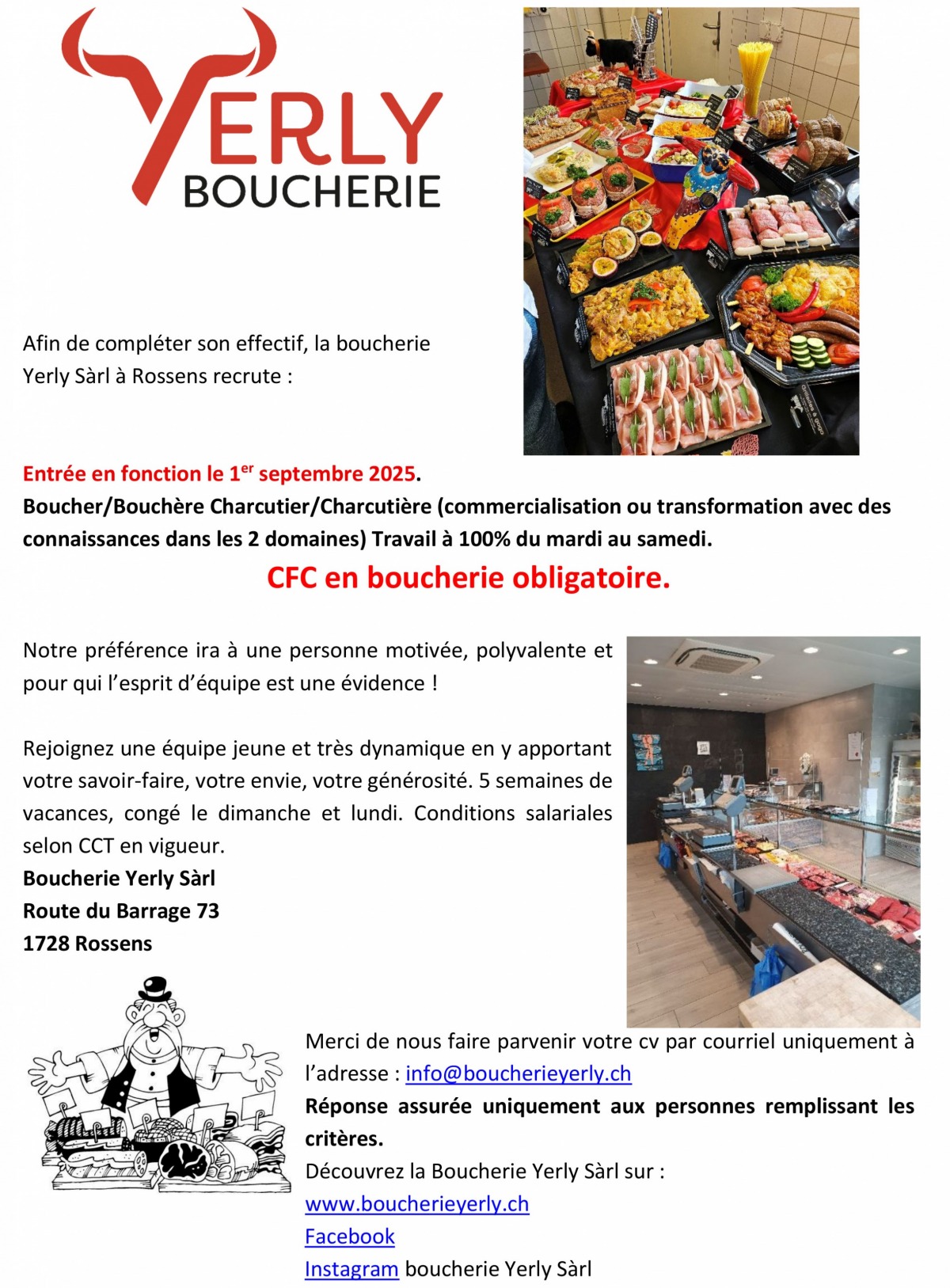 La Boucherie Yerly Sàrl à Rossens est à la recherche d'un·e boucher·ère-charcutier·ère pour le 1er septembre 2025.